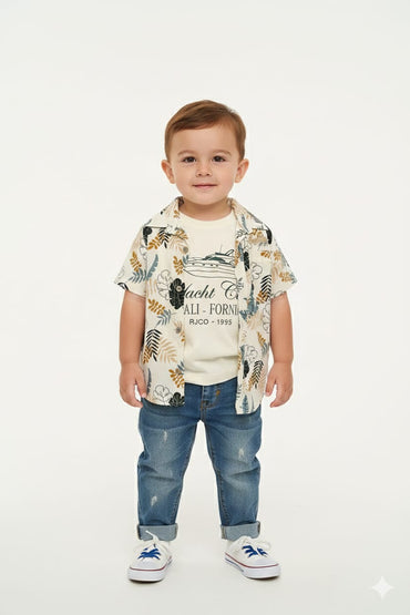Boys' Cream Tropical Leaf Print Short-Sleeve Vacation Shirt