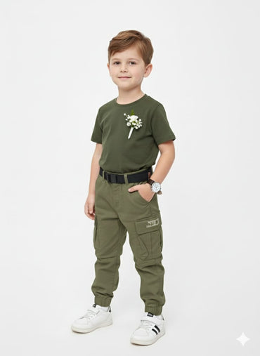 Regular price Rs. 750.00Sale price Rs. 750.00 Regular priceUnit price perThese pants include large cargo flap pockets on the outer thighs for a rugged appearance.Waist & Cuffs: The design features an elasticated waistband with a drawstring...
