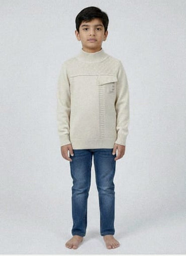 Regular price Rs. 1,380.00Sale price Rs. 1,380.00 Regular priceUnit price perA tan mockneck sweater for a young person, featuring a distinctive pattern mix. It has a textured diamond-shaped knit across the chest bordered by a ribbed...