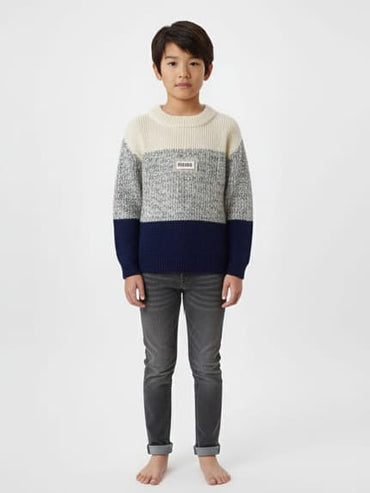 Regular price Rs. 1,380.00Sale price Rs. 1,380.00 Regular priceUnit price perThis is a comfortable, stylish color-block sweater for boys, featuring a classic crew neck design. The sweater has three distinct horizontal blocks of color: Top: Cream...