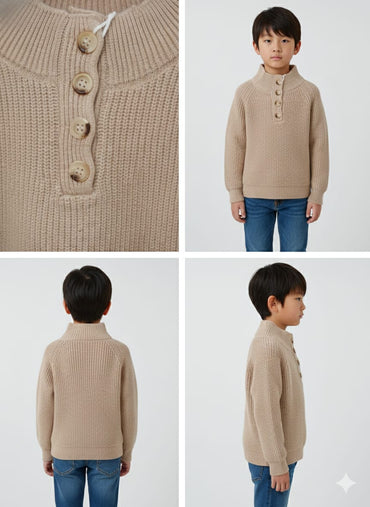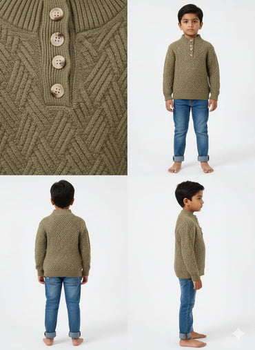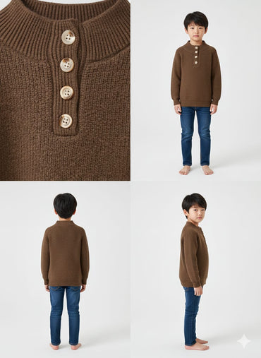 Regular price Rs. 1,200.00Sale price Rs. 1,200.00 Regular priceUnit price perA cozy, brown knit sweater for boys, featuring a high collar and a four-button henley placket with light-colored buttons.