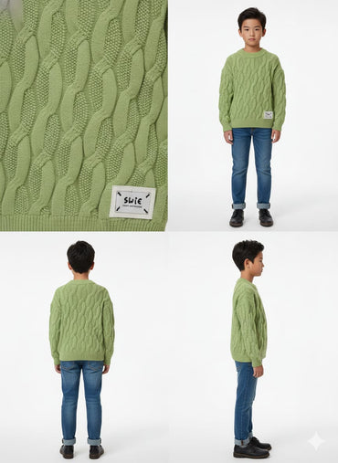 Regular price Rs. 1,200.00Sale price Rs. 1,200.00 Regular priceUnit price perThis is a small, cropped image of a child's bright green cable-knit sweater by the brand "swie".