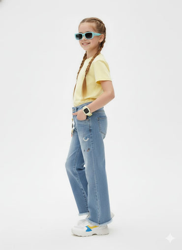 Regular price Rs. 1,400.00Sale price Rs. 1,400.00 Regular priceUnit price perHigh-rise, palazzo-style jeans with wide leg. This silhouette is a staple of current retro-inspired kids' fashion. Embellishments: The jeans feature intricate silver rhinestone detailing. Specifically, they...