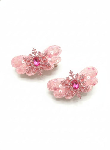 Design: These clips feature a light purple, scalloped fabric base that resembles a butterfly wing or cloud. Embellishments: Each clip is adorned with a glittery blue...