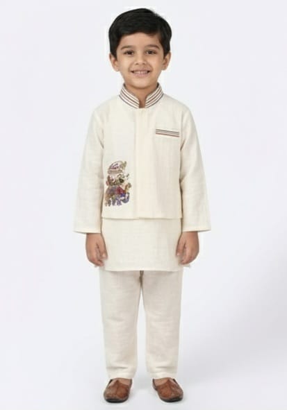 This ensemble is an elegant and understated ethnic set for a young boy, featuring a monochromatic cream or off-white colour palette. It is ideal for cultural events, ceremonies, or casual festive wear.