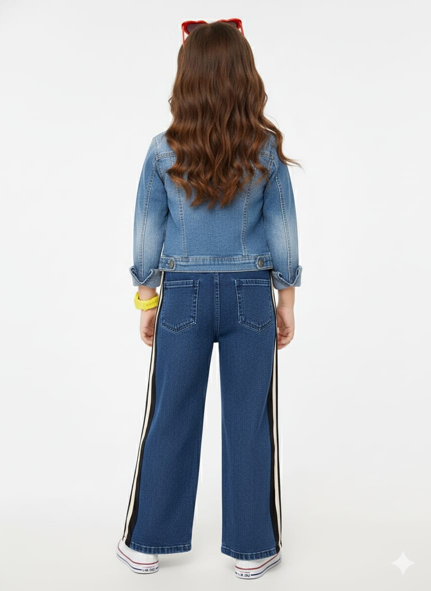 Wide-leg or straight-cut denim featuring vertical side stripes and a paper-bag style drawstring waist. Side-stripe detailing on the jeans and the drawstring waist give the outfit a track-pant vibe, making it look more relaxed and modern than standard jeans.