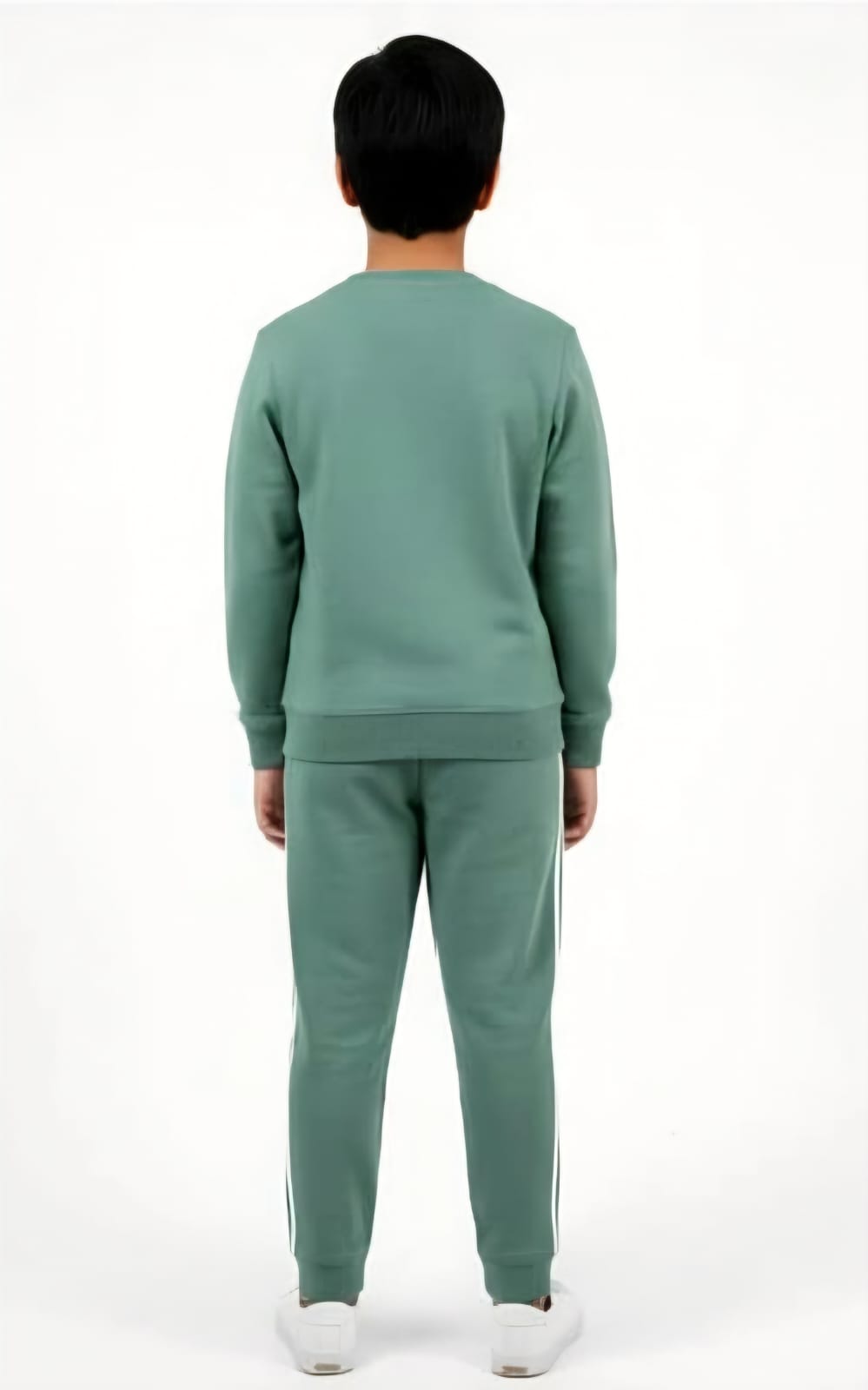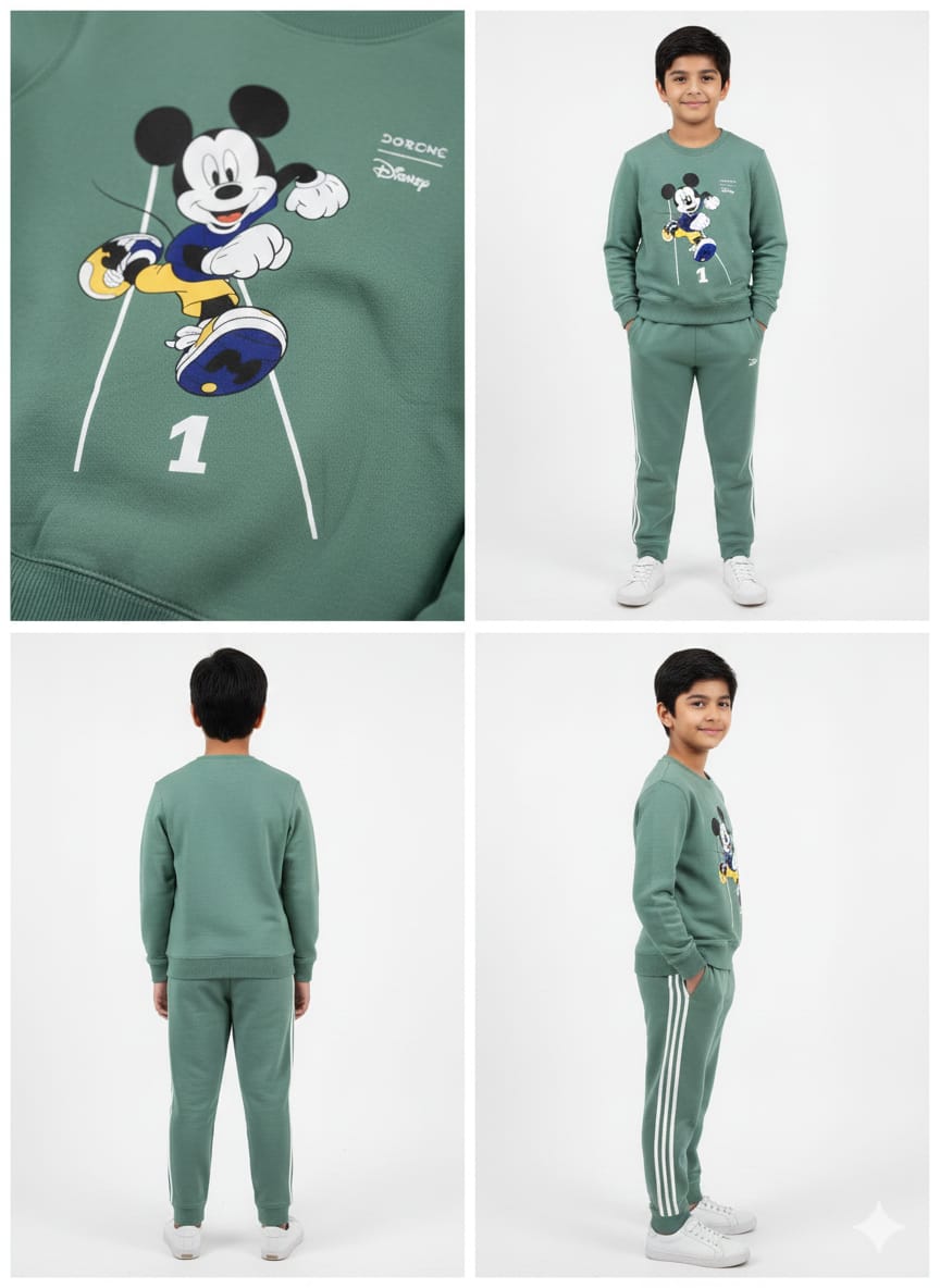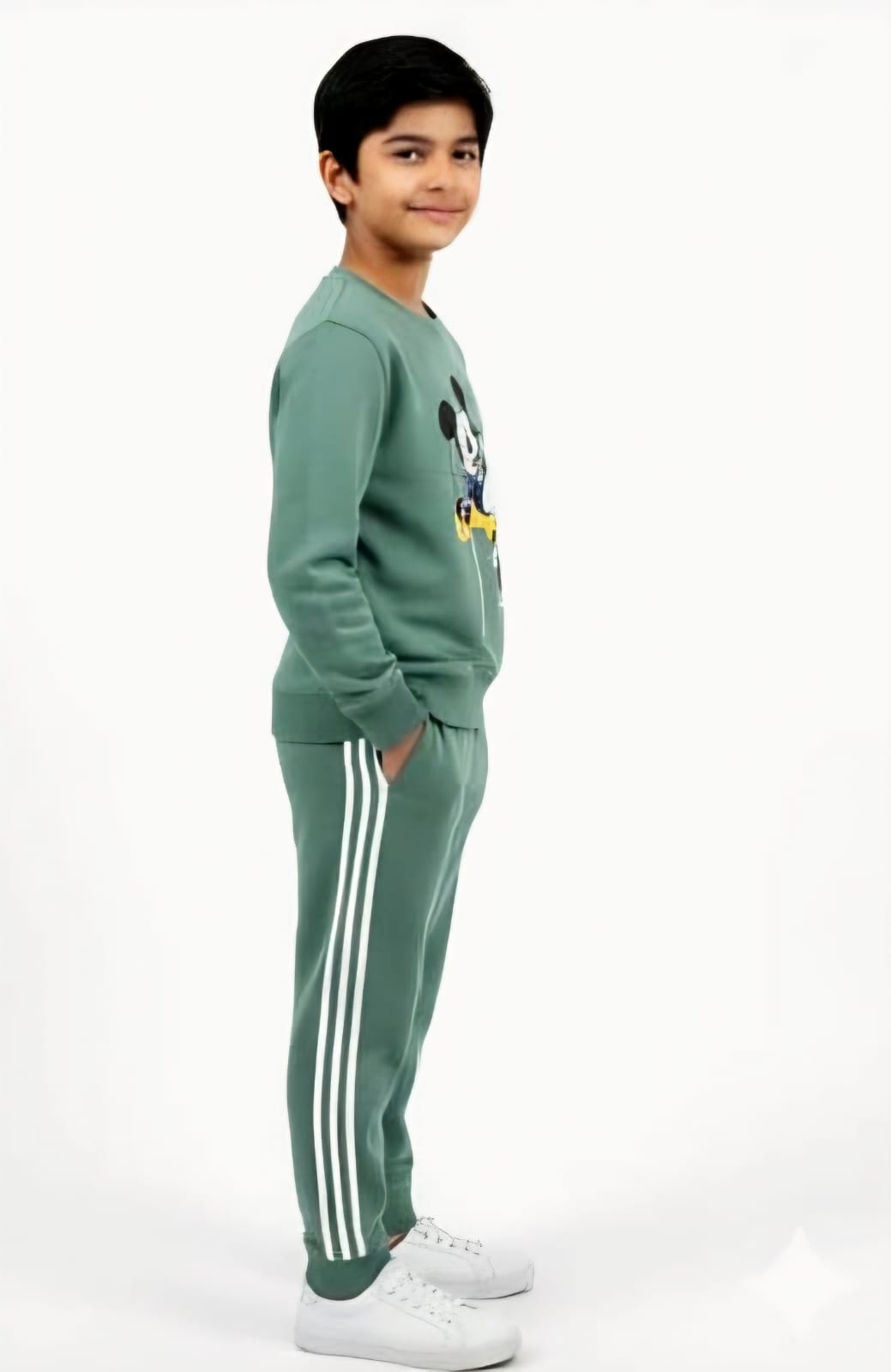 This is a comfortable, sage-green sweat set for boys featuring a playful and sporty Disney Mickey Mouse graphic.