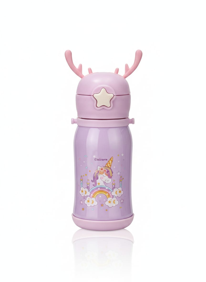 Magical Design: Each bottle features a colorful unicorn graphic—a winged unicorn with a rainbow on the white model and a sleeping unicorn above a rainbow on the purple model.