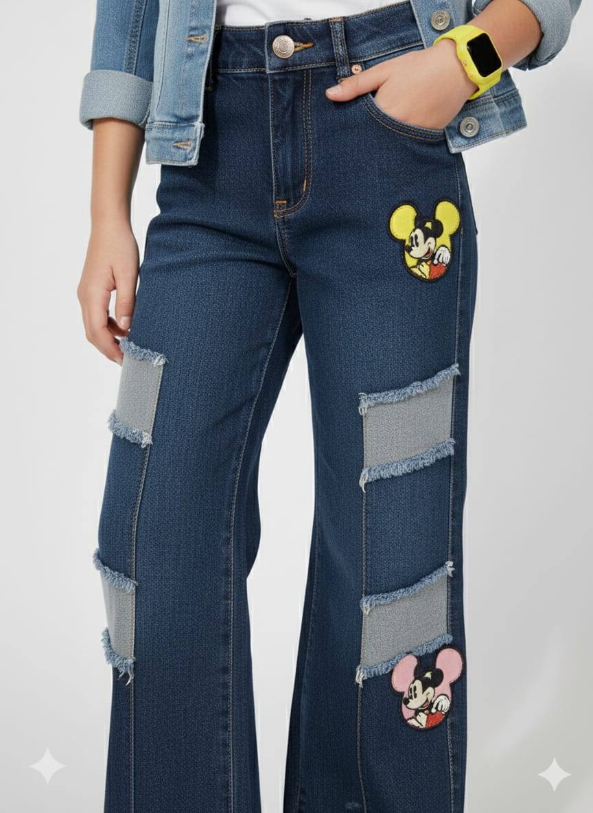 retro-style jeans! They have a great mix of texture and character that would appeal to any Mickey Mouse fan, High-waisted, wide-leg denim trousers (often referred to as "flares" or "palazzo" jeans for kids. A dark indigo denim with a subtle crosshatch texture