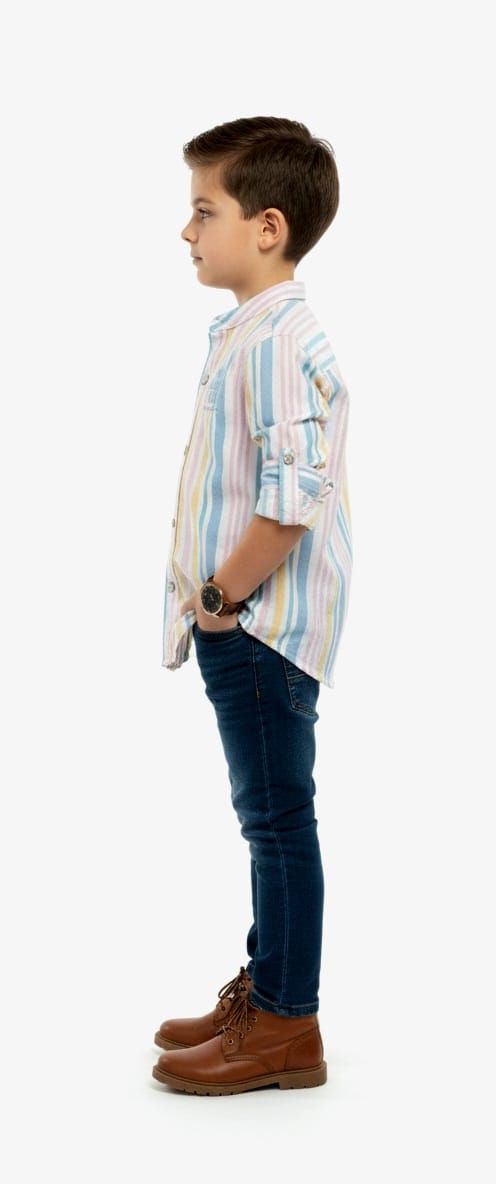 A long-sleeved button-up with vertical pastel stripes (soft blue, yellow, and pink). The sleeves are rolled up and secured with a button tab, often called a "roll-tab sleeve," which keeps the look relaxed.