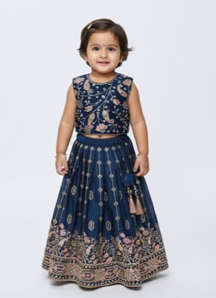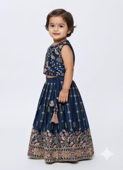 A lehenga choli is a traditional three-piece Indian ensemble widely worn for weddings, festivals, and formal celebrations. While the style in your image specifically features a navy-blue silk finish with paisley embroidery.