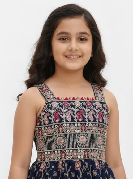 The top features a broad, heavily embroidered yoke/bodice in multi-colours (red, pink, gold). The rest of the top and border have contrasting embroidery or threadwork.