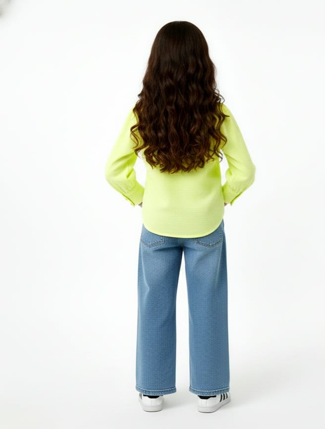 A bright Neon Green button-down shirt. It features fun, textured patches: a checkered heart on the chest and a shooting star/rainbow motif near the hem.