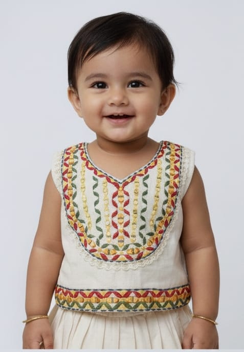 - Top (Choli): A cream-colored sleeveless top featuring a deep V-shaped embroidered pattern around the neck and a matching border at the waist. The embroidery utilizes geometric and floral patterns in green, red, and yellow.