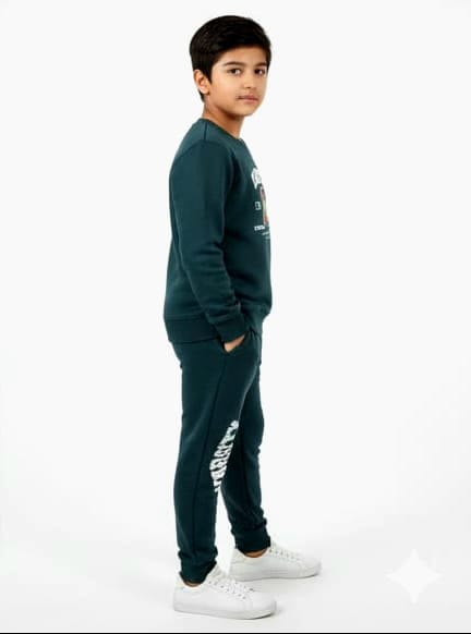 This is a comfortable, dark green sweat set for boys with a classic varsity division theme.