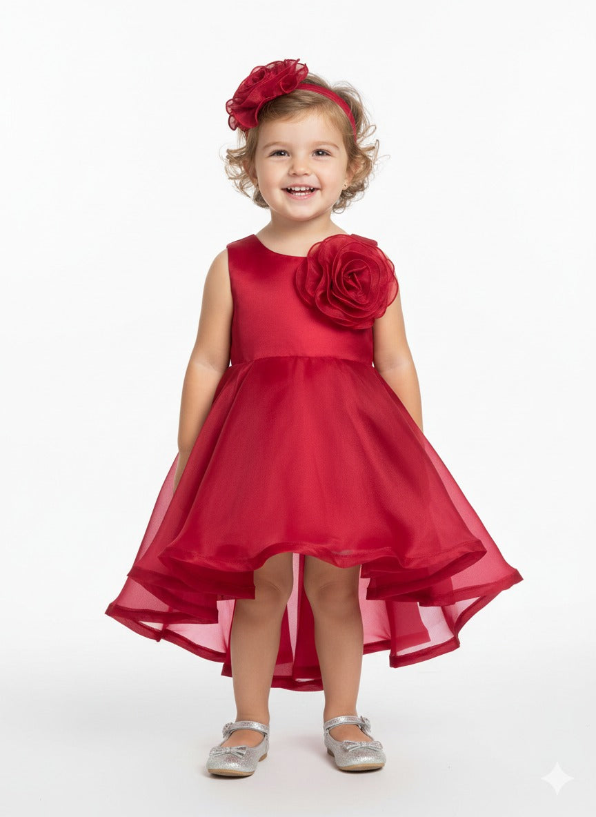 - Floral Accents: A large, 3D organza fabric rose is pinned to the left shoulder, matching a similar oversized floral bloom on the red headband.