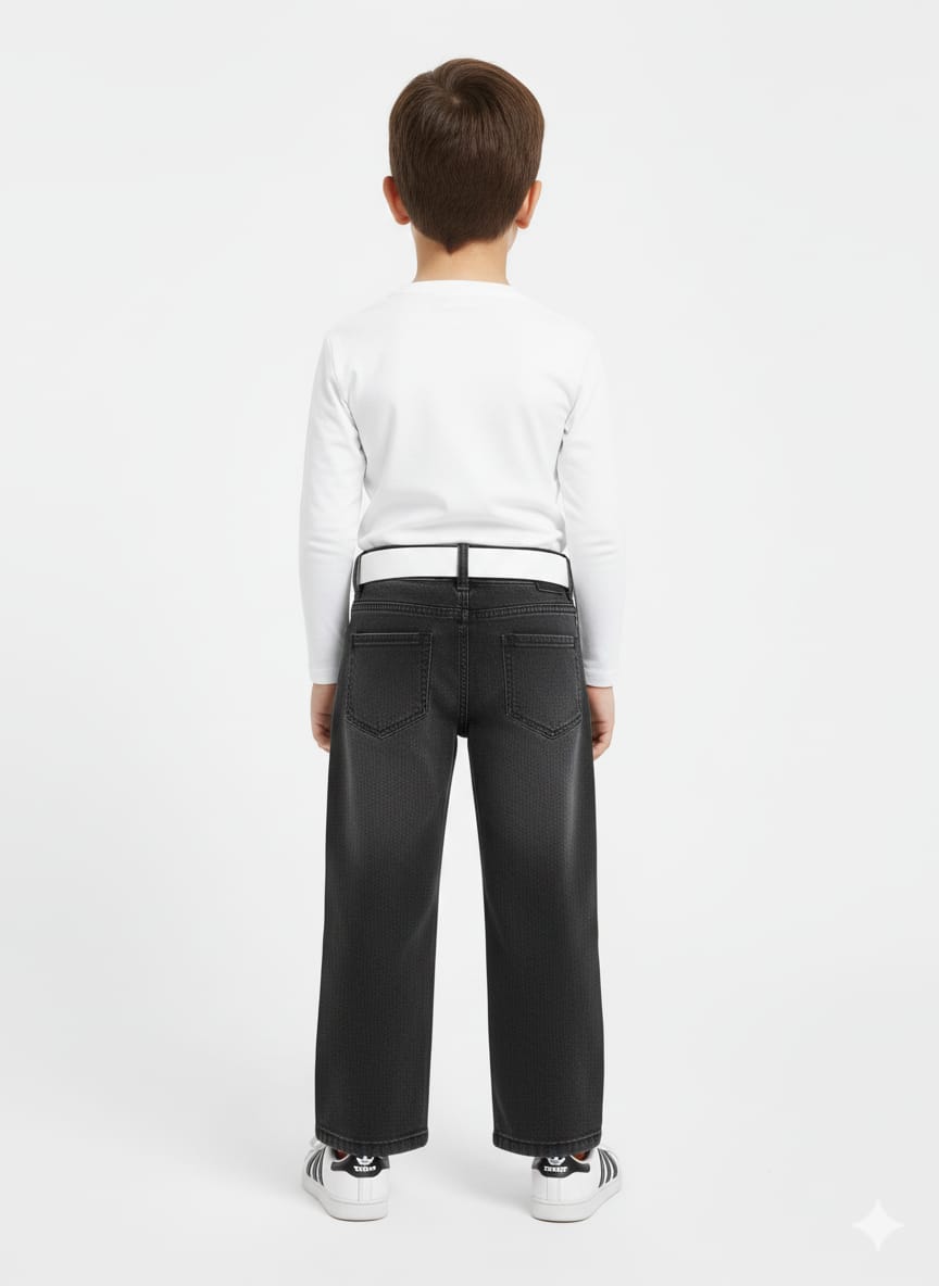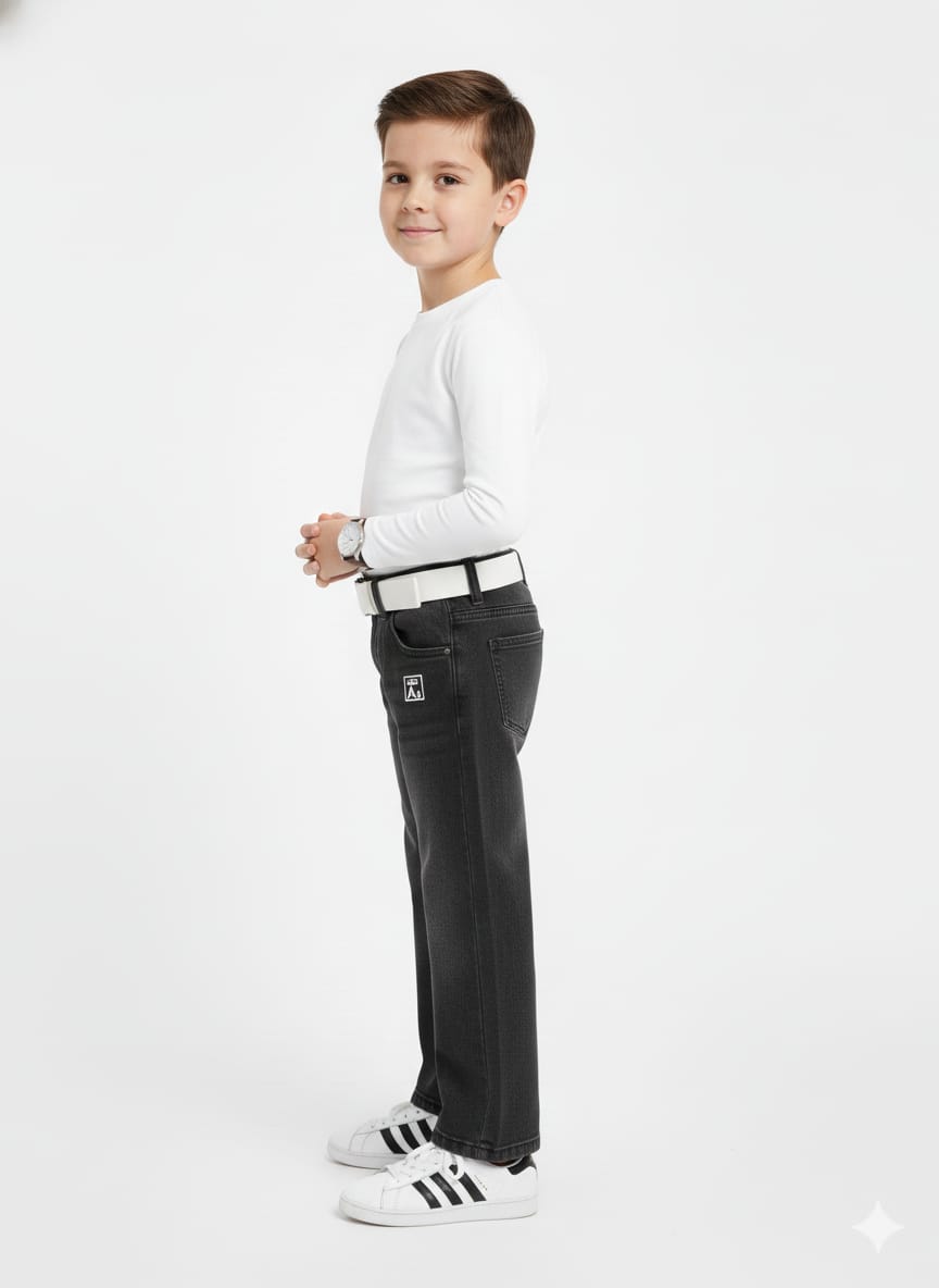 Bottoms: "Washed black" denim jeans. They have a straight-leg fit and feature a small, white rectangular logo patch with the letters "Ab" on the upper left thigh.